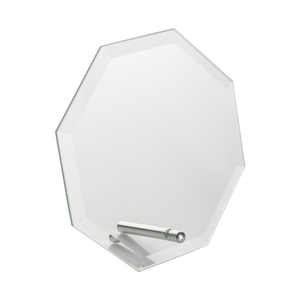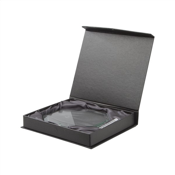 Ośmioboczny szklane trofeum w czarnym, ozdobnym opakowaniu.