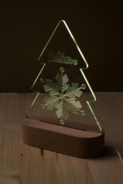 Wykonane na zamówienie, akrylowe trofeum w kształcie choinki na drewnianej podstawie, z wielokolorowym oświetleniem LED zasilanym przez USB. W zestawie kabel USB do ładowania. Cena zawiera grawerunek akrylowej choinki. Min. ilość: 25 szt.