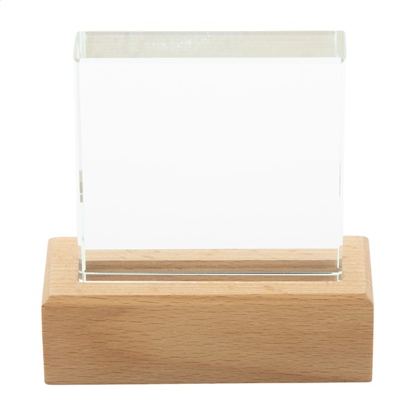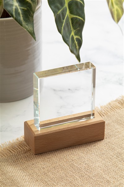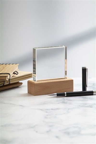 Szklane trofeum z podstawą z drewna bukowego. W pudełku prezentowym z papieru kraft.