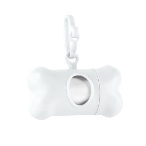 Dozownik na torebki higieniczne dla psów, w kształcie kości, wykonany z materiału z PP. Zawiera 20 higienicznych worków dla psa wykonanych z PE. Zamknięte: 111 x 21 x 15 mm