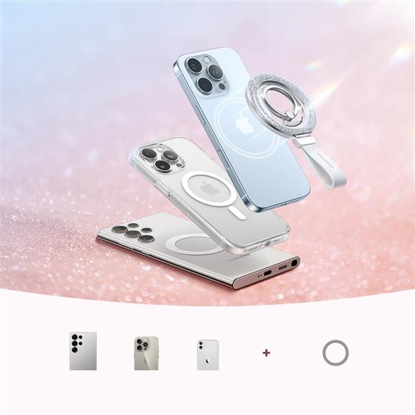 Uchwyt Joyroom JR-ZS425 to stylowe i funkcjonalne akcesorium, które łączy w sobie modny design z praktycznymi rozwiązaniami. Błyszcząca, brokatowa obwódka nadaje smartfonowi elegancki wygląd, a jednocześnie zapewnia wygodne i pewne trzymanie urządzenia. Dzięki silnym magnesom N56 uchwyt błyskawicznie przyczepia się do telefonów z MagSafe oraz etui magnetycznych, a dołączony pierścień metalowy umożliwia użycie także z innymi modelami. Obracany o 360° ring i składana podstawka 120° sprawiają, że korzystanie z telefonu staje się jeszcze wygodniejsze – zarówno w pionie, jak i w poziomie. To praktyczne akcesorium, które ułatwia codzienne użytkowanie telefonu, dodając mu wyjątkowego charakteru.