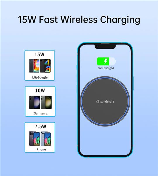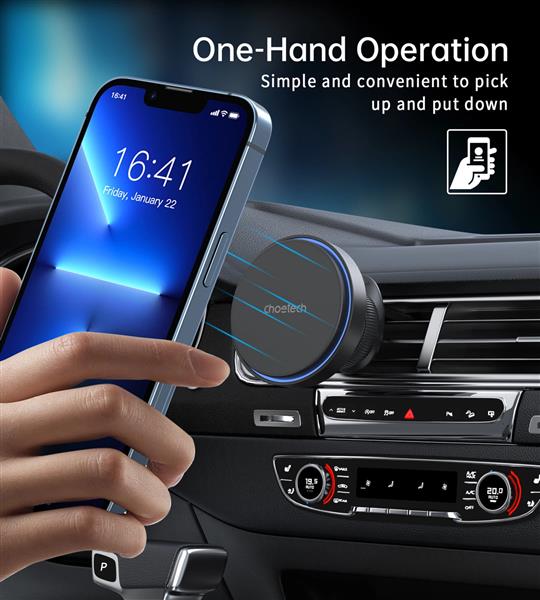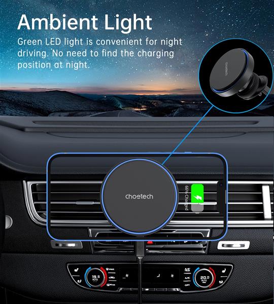 Uchwyt Choetech T205-F efektywnie naładuje telefon mocą do 15W. Specjalnie zaprojektowany klips z antypoślizgowym silikonem i podwójną blokadą zapewnia stabilność na różnych rodzajach kratek wentylacyjnych. Uchwyt jest też wyposażony w delikatne światło LED, które nie tylko ułatwia odnalezienie uchwytu w ciemności, ale również zapewnia przyjemną atmosferę podczas nocnych podróży.