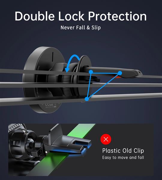 Silikonowy klips z podwójną blokadą i mocne magnesy stabilnie utrzymają telefon na miejscu. Nie musisz się już martwić o wypadnięcie telefonu podczas gwałtownych manewrów czy nierówności na drodze.