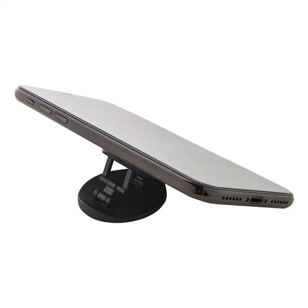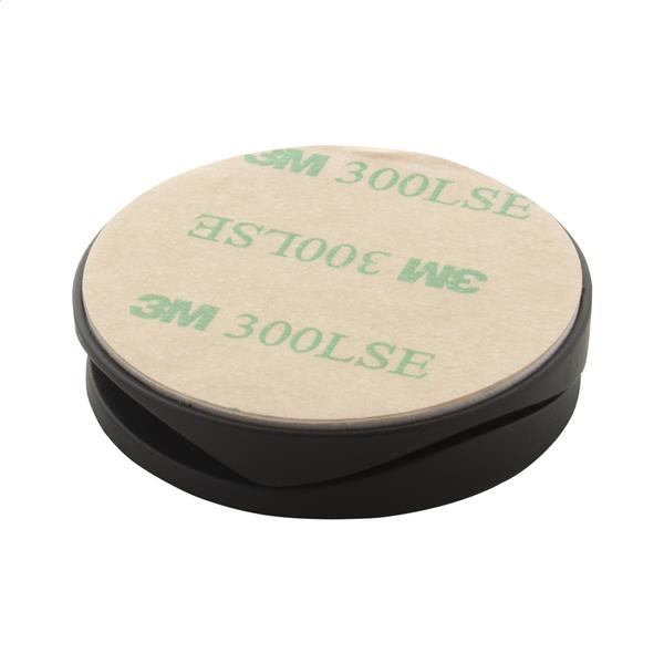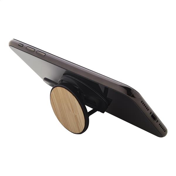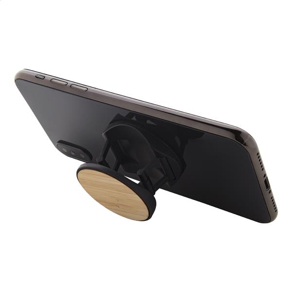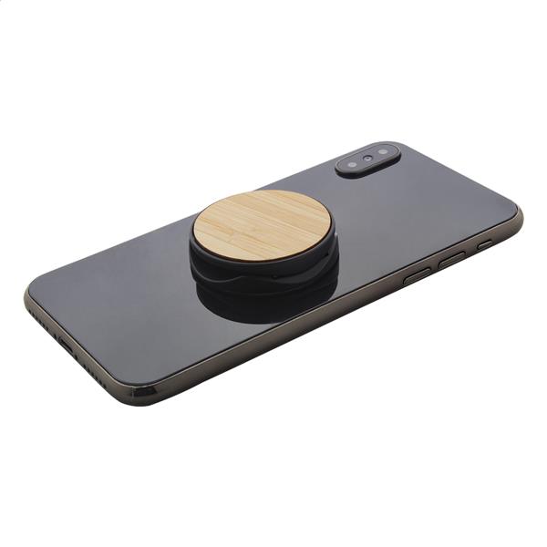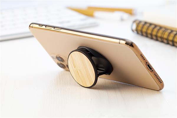 Pokryty bambusem, okrągły, plastikowy uchwyt na telefon z samoprzylepną podstawą.