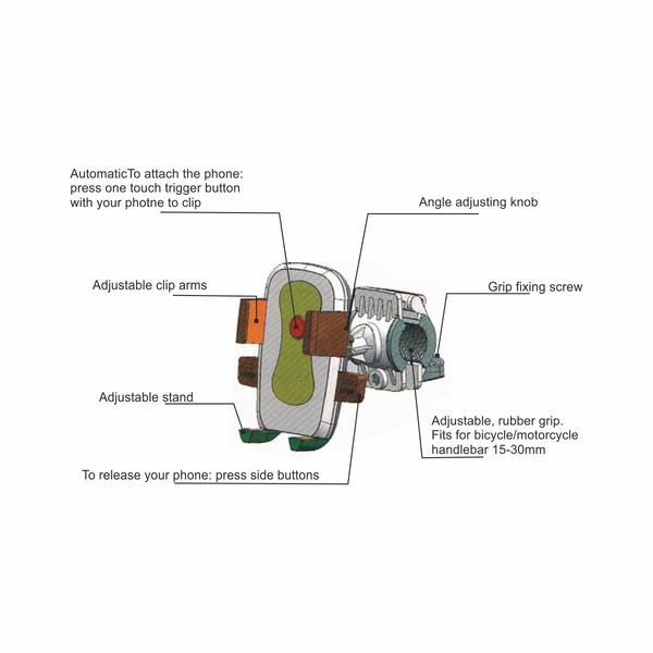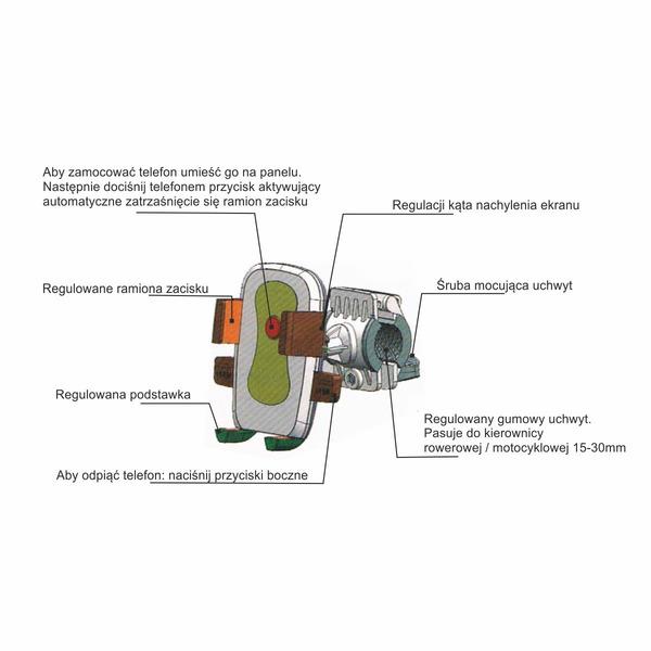 Uchwyt na telefon montowany do kierownicy. Pasuje do telefonów o szerokości 5,5 – 8,5 cm. Regulacja kąta nachylenia. Mechanizm zaciskowy umożliwia mocowanie i zdejmowanie telefonu z uchwytu jedną ręka.