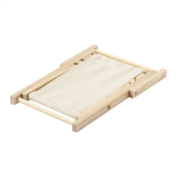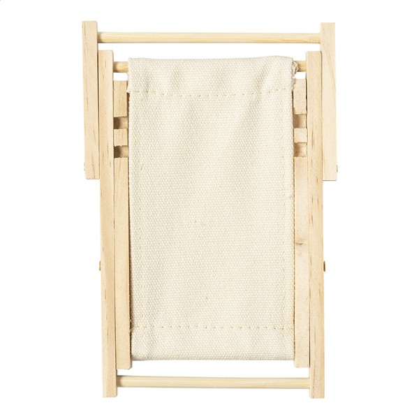 Składany uchwyt na telefon w kształcie leżaka, wykonany z drewna i bawełny.
