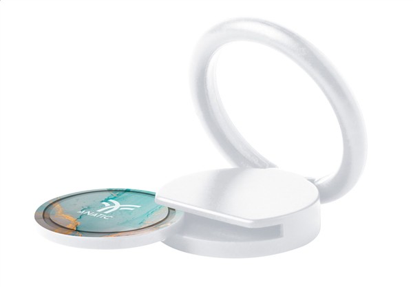 Okrągły, plastikowy uchwyt na telefon z samoprzylepną podstawą i żetonem do wózków na zakup.