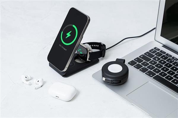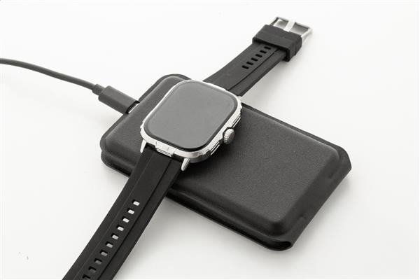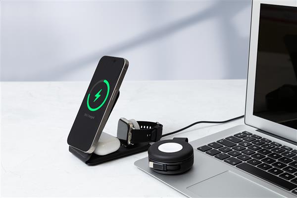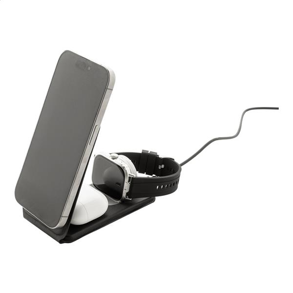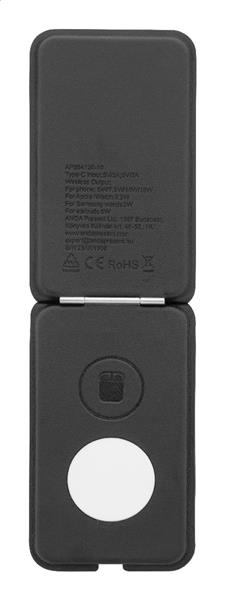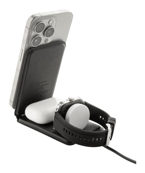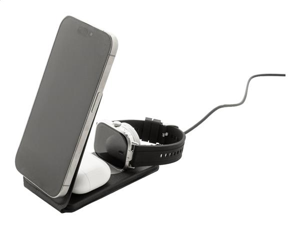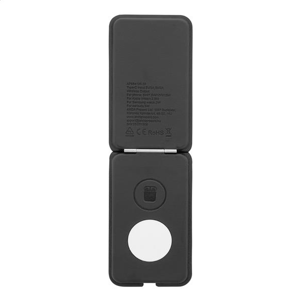 Luksusowy, składany uchwyt na telefon komórkowy i bezprzewodowa ładowarka z recyklingowanej skóry PU. Z magnetyczną szybką ładowarką bezprzewodową (15 W), bezprzewodową ładowarką (5 W) do słuchawek (tylko Apple®) oraz bezprzewodową ładowarką (2,5 W) do smartwatchy (Apple® i Samsung®). W zestawie samoprzylepny metalowy pierścień do korzystania z funkcji magnetycznej w dowolnym urządzeniu z funkcją ładowania bezprzewodowego. Kompatybilny z iPhone® 12 i nowszymi. W zestawie kabel USB do ładowania.
