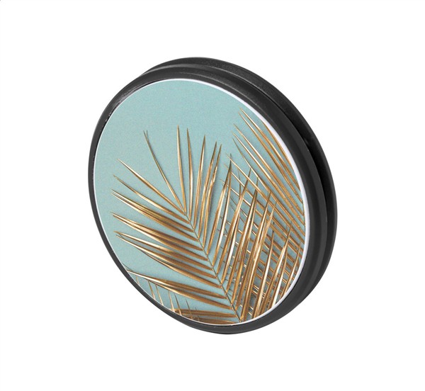 Plastikowy, okrągły uchwyt na telefon z samoprzylepną powierzchnią.
