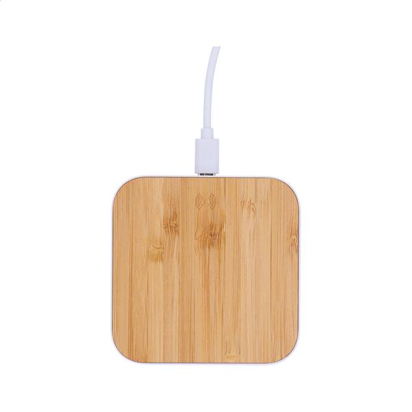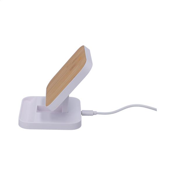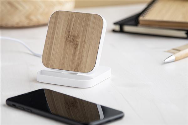 Uchwyt na telefon z tworzywa ABS z recyklingu z wbudowaną szybką ładowarką indukcyjną pokrytą bambusem (15 W). Zawiera kabel USB.