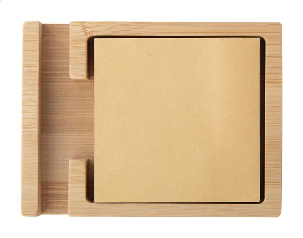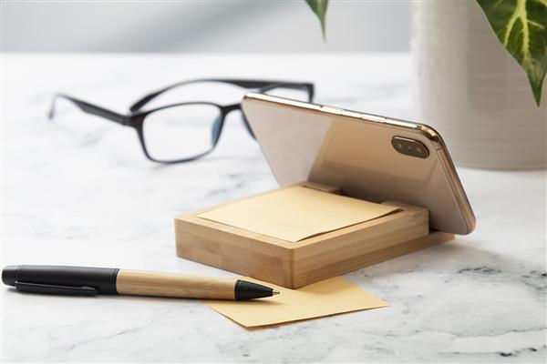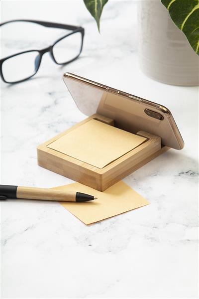 Bambusowy uchwyt na telefon komórkowy ze 125 kartkami do notowania z papieru kraft pochodzącego z recyklingu (75×75 mm).
