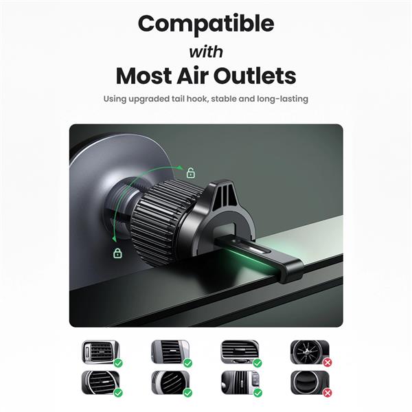 Dzięki wydłużonemu haczykowi uchwyt Ugreen CD345 jest kompatybilny z różnorodnymi kratkami nawiewu, zarówno pionowymi, jak i poziomymi. To zapewnia łatwość instalacji i stabilność uchwytu w niemal każdym samochodzie.
