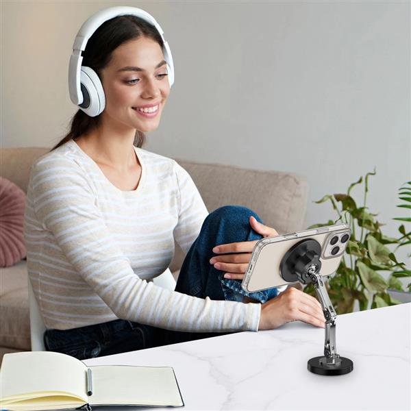 Wykonany z wysokiej jakości stopu cynku i tworzywa ABS, charakteryzuje się wyjątkową trwałością i odpornością na codzienne użytkowanie. Regulowane ramię i przeguby kulowe pozwalają dostosować kąt nachylenia telefonu, zapewniając optymalną widoczność i komfort użytkowania.