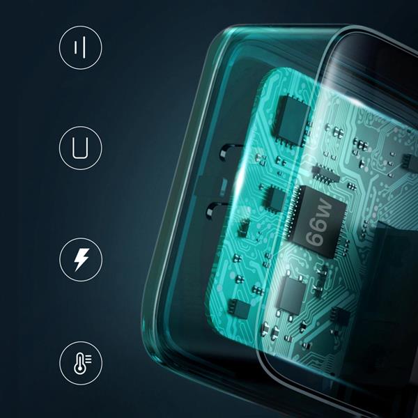 Ładowarka Ugreen CD216 posiada dwa porty USB Typ C, które mogą zasilać mocą do 66 W. Co ważne, wbudowany w nią układ scalony inteligentnie dopasowuje parametry ładowania do podłączonych urządzeń. Jeśli ładujesz wyłącznie laptop, ładowarka będzie działała z mocą 66 W. Jeśli chcesz naładować jednocześnie laptop i smartfon, podzieli ona energię 45 W + 20 W.