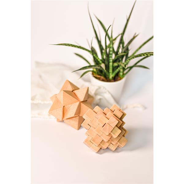 Wykonana z drewna układanka logiczna. Relaks i test dla naszego umysłu. Zawiera 24 elementy. Pakowana w płócienny woreczek (170 x 145 mm) Dołączona instrukcja składania.