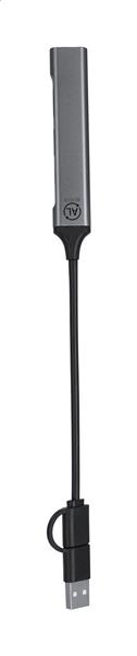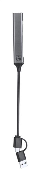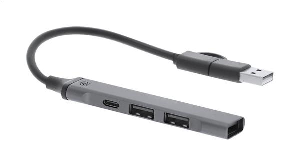 Hub USB z aluminium pochodzącego z recyklingu, z 3 portami USB (USB 2.0) i 1 USB-C (USB 3.0). Zawiera kabel ze złączami USB i USB-C.