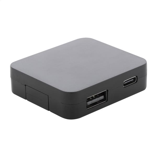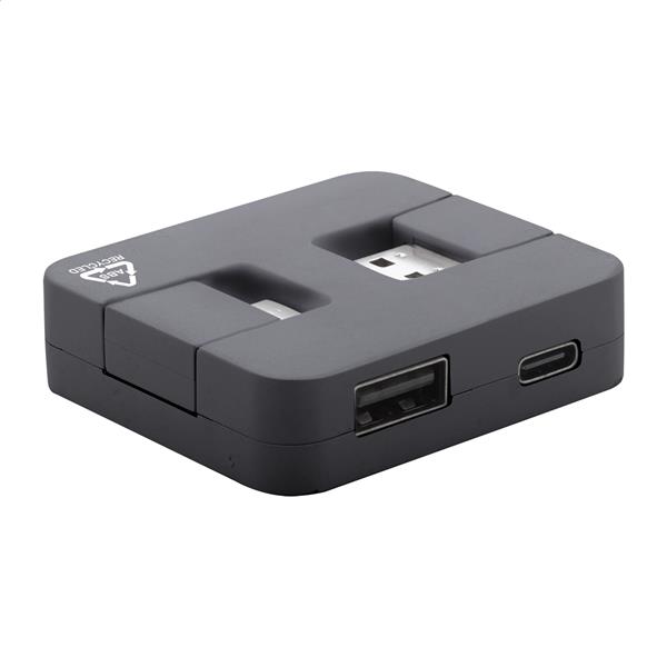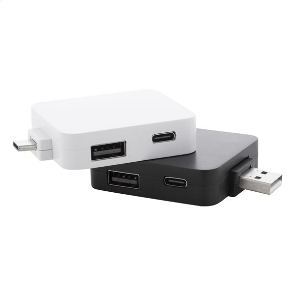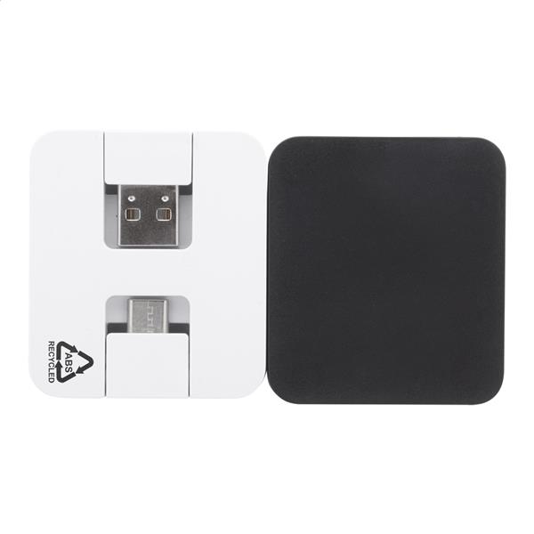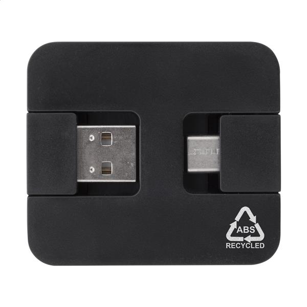 Hub USB z tworzywa ABS pochodzącego z recyklingu, z 2 portami USB i 2 portami USB-C. Ze składanymi złączami USB i USB-C. USB 2.0.