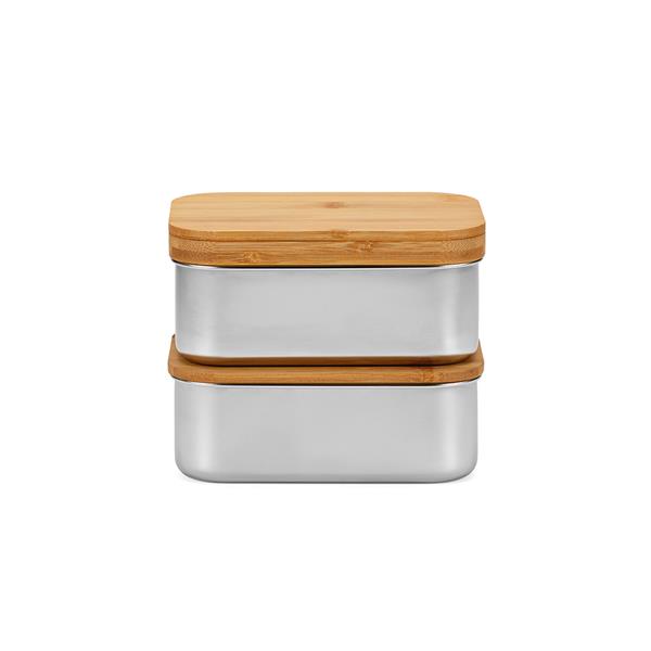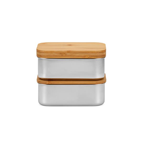 Nasz zestaw lunchbox o pojemności 1480 ml (980 ml netto) to delikatny towarzysz z dwiema przegrodami. Wykonany ze stali nierdzewnej pochodzącej z recyklingu, z bambusową pokrywką, która mieści widelec, nóż i łyżkę. Elastyczny pasek zabezpiecza pokrywkę i obie części razem podczas przygód w podróży.