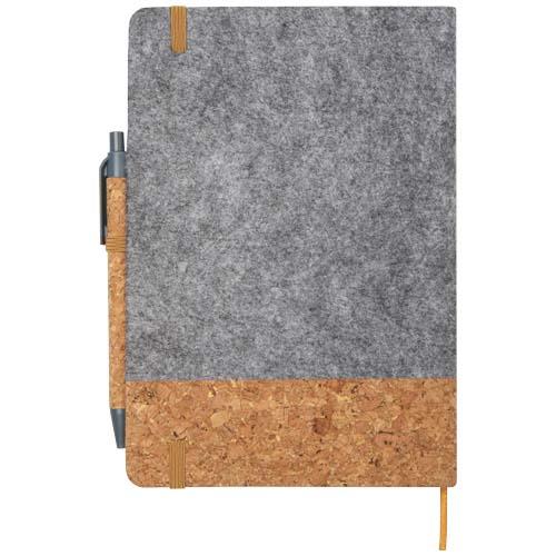 Notatnik A5 w twardej okładce wykonany z korka i filcu pochodzącego z recyklingu z 80 kartkami w linie z papieru o gramaturze 70 g/m2, z elastycznym zamknięciem, tasiemkową zakładką i pętelką na długopis. Przycisk, klips i końcówka długopisu wykonane są z tworzyw sztucznych pochodzących z recyklingu, a korpus z korka. Tusz długopisu: Czarny. Żywotność: 600 metrów. Rozmiar stalówki: 1,0 mm.