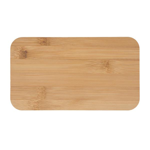 Lunch box zamykany taśmą elastyczną. Posiada dwa pojemniki o pojemności 500 ml każdy. Wyposażony w widelec, łyżkę, nóż oraz bambusową deseczkę do krojenia.