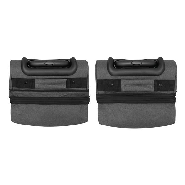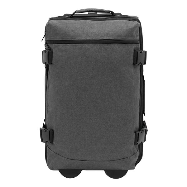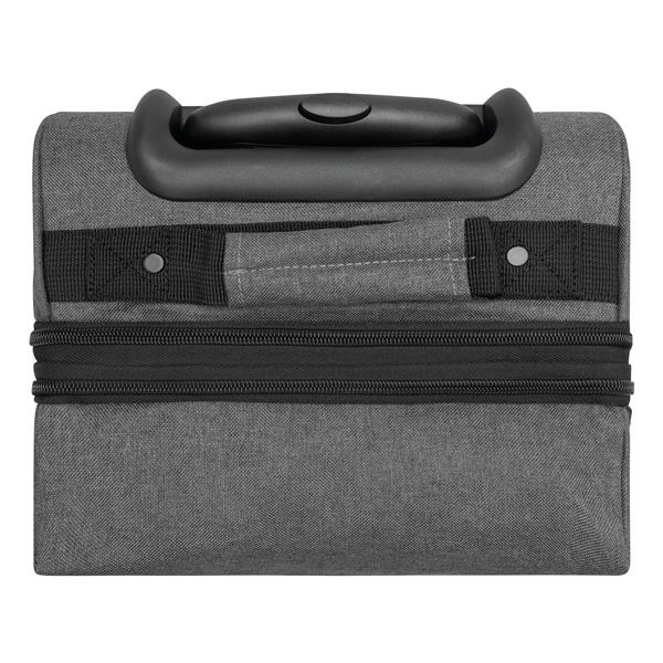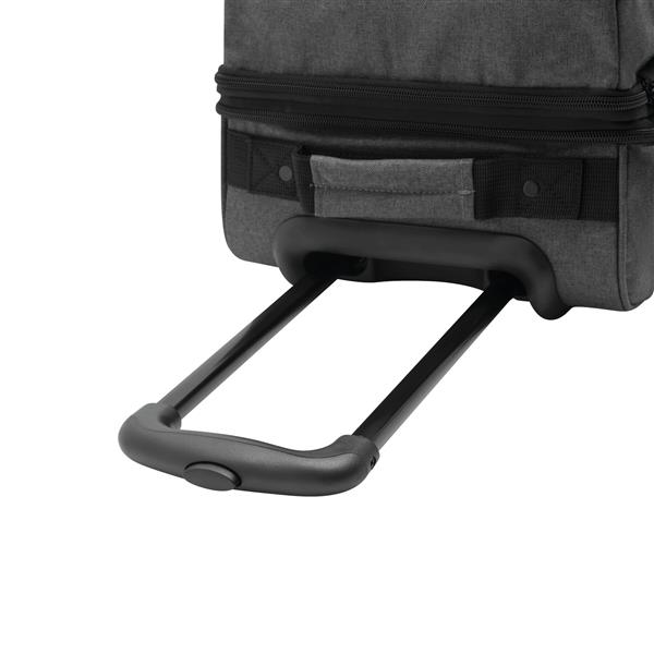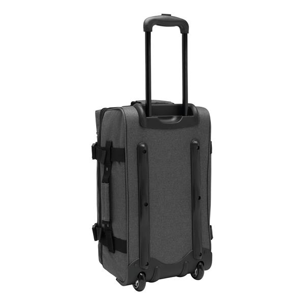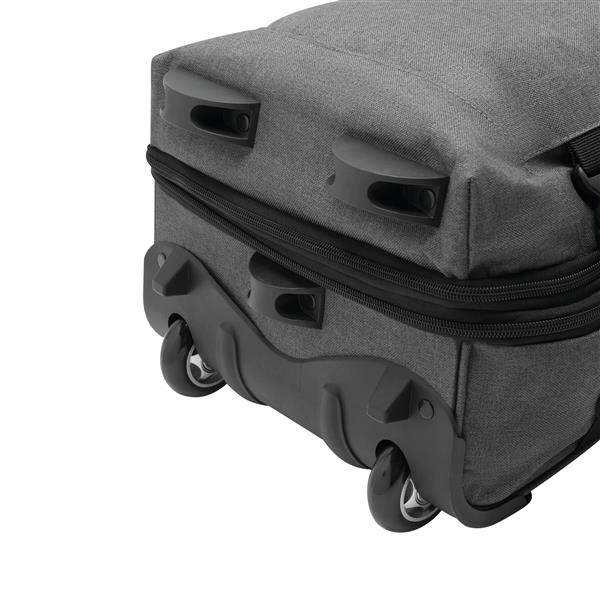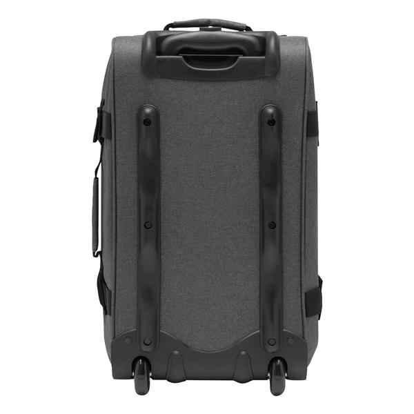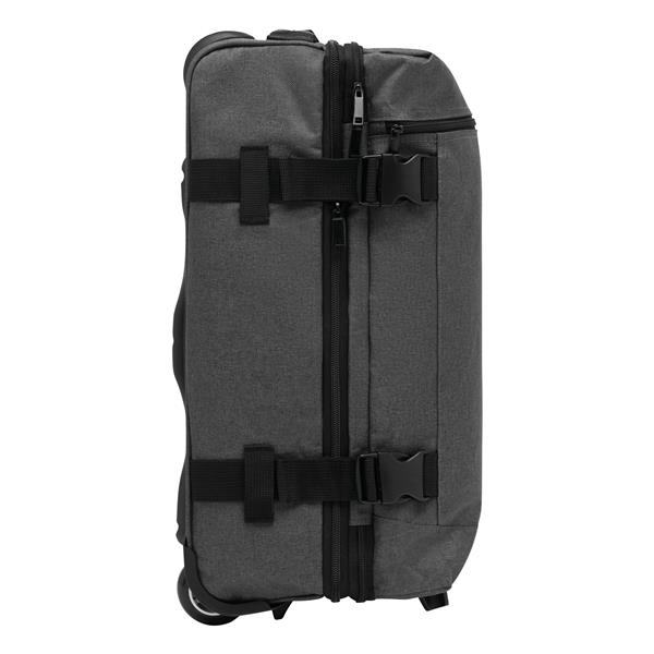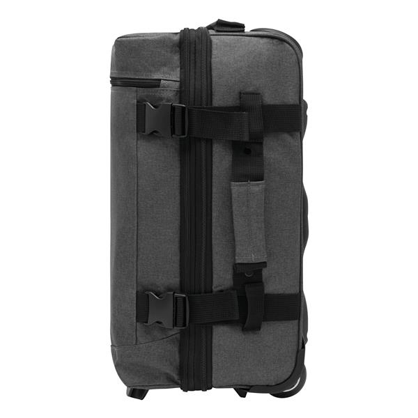 Torba podróżna na kółkach VISBY. Kieszeń przednia na zamek, główna komora z dodatkowym zamkiem do powiększenia pojemności o ok. 10%, po obu stronach 2 paski ściągające zapinane na klamry, 2 wyściełane uchwyty do przenoszenia, wysuwana rączka do ciągnięcia torby, lekko jeżdżące kółka z ochraniaczami rogów, od spodu 2 płozy i stopki do podparcia o podłoże.