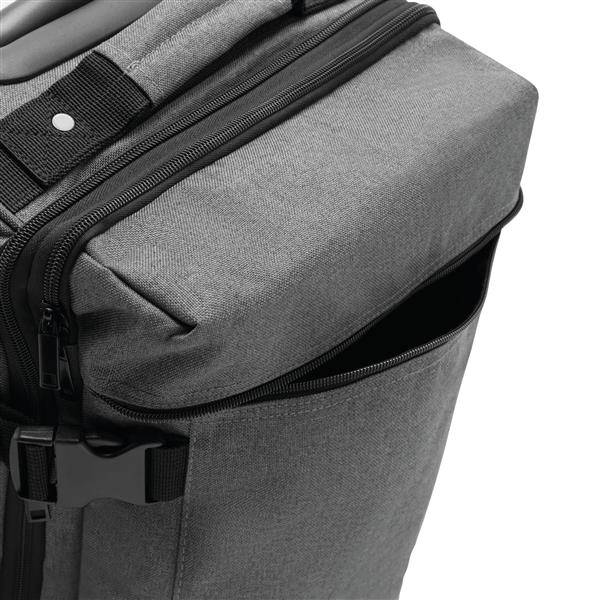 Torba podróżna na kółkach VISBY. Kieszeń przednia na zamek, główna komora z dodatkowym zamkiem do powiększenia pojemności o ok. 10%, po obu stronach 2 paski ściągające zapinane na klamry, 2 wyściełane uchwyty do przenoszenia, wysuwana rączka do ciągnięcia torby, lekko jeżdżące kółka z ochraniaczami rogów, od spodu 2 płozy i stopki do podparcia o podłoże. […]