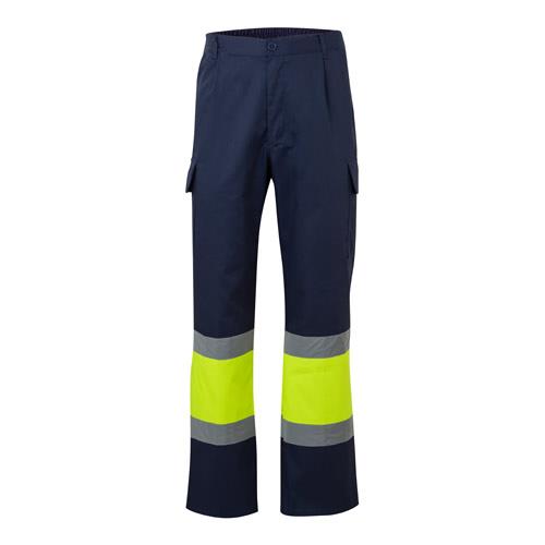 „Dwukolorowe spodnie z diagonalu (190g/m2), wykonane z bawełny (20%) i poliestru (80%). Elastyczny pas, z odblaskowymi paskami na dole spodni i pięcioma kieszeniami (2 kieszenie francuskie, 2 boczne kieszenie mieszkowe i 1 kieszeń z tyłu). Produkt zgodny z rozporządzeniem UE 2016/425, certyfikowany przez EN20471 i klasę No 1. Rozmiar: S, M, L, XL, 2XL, 3XL