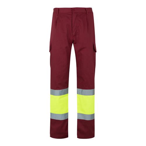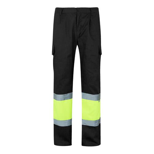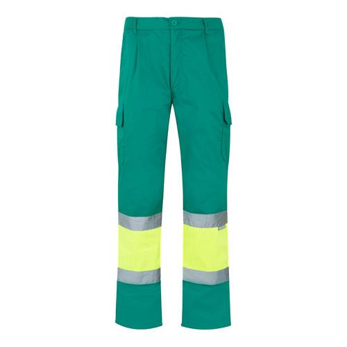Spodnie dwukolorowe, diagonalne (210g/m2), na podszewce, z wieloma kieszeniami, z bawełny (20%) i poliestru (80%). Z gumką w pasie, z odblaskowymi paskami u dołu spodni. Zawiera sześć kieszeni (2 Kieszenie francuskie, 2 boczne kieszenie mieszkowe i 2 tylne). Produkt zgodny z rozporządzeniem UE 2016/425, certyfikowany przez EN20471 i klasę No 1. Rozmiar: S, M, L, XL, 2XL, 3XL