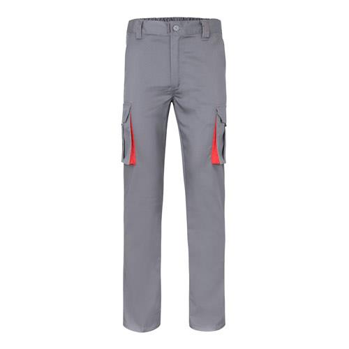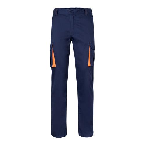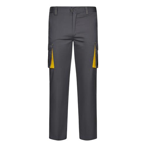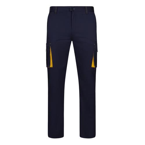 Dwukolorowe, elastyczne spodnie z wieloma kieszeniami (240g/m2), wykonane z bawełny (46%), EME (38%) i poliestru (16%). Krój slim fit, elastyczny pas i kontrastowy kolor klinów, ściągaczy i szwów. Zawiera sześć kieszeni (2 kieszenie francuskie, 2 boczne kieszenie z klinem i 2 tylne kieszenie z klinem). Size: 34, 36, 38, 40, 42, 44, 46, 48, 50, 52, 54, 56, 58, 60