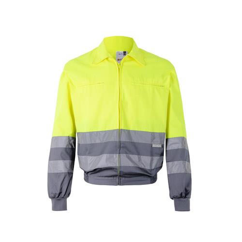 Dwukolorowa kurtka (210 g/m2) z poliestru (80%) i bawełny (20%). Centralny zamek błyskawiczny, elastyczny pas boczny i prążkowane mankiety. Odblaskowe paski na tułowiu i rękawach oraz dwie kieszenie na piersi z zamkiem błyskawicznym. Produkt zgodny z rozporządzeniem UE 2016/425, certyfikowany przez EN20471 i klasę No 2. Rozmiar: S, M, L, XL, 2XL, 3XL