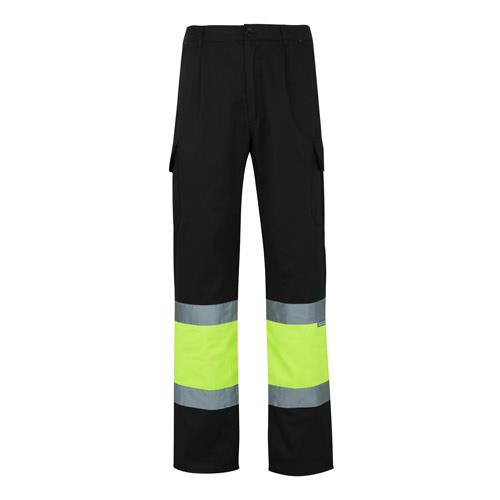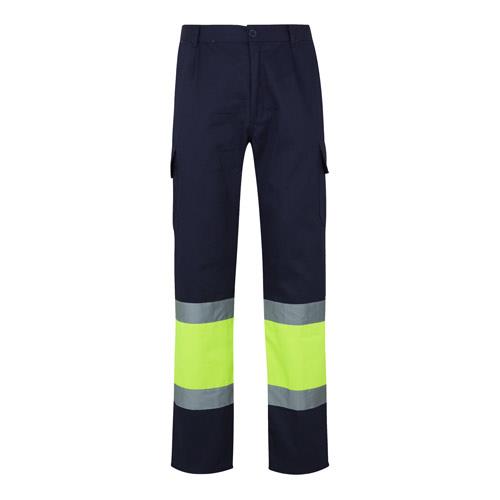 „Dwukolorowe spodnie z wieloma kieszeniami o diagonalnym splocie (210g/m2), wykonane z bawełny (20%) i poliestru (80%). Z gumką w pasie i odblaskowymi paskami u dołu spodni. Zawiera sześć kieszeni (2 francuskie, 2 boczne kieszenie mieszkowe i 2 tylne kieszenie mieszkowe). Produkt zgodny z rozporządzeniem UE 2016/425, certyfikowany przez EN20471 i klasę No 1. Rozmiar: S, M, L, XL, 2XL, 3XL