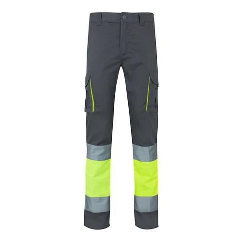 „Dwukolorowe, elastyczne spodnie z wieloma kieszeniami (240g/m2), wykonane z bawełny (46%), EME (38%) i poliestru (16%). Z gumką w pasie i odblaskowymi paskami u dołu spodni. Kontrastowy kolor na miechach, ściągaczach i materiale pomiędzy paskami odblaskowymi. Sześć kieszeni (2 kieszenie francuskie, 2 boczne kieszenie mieszkowe i 2 tylne). Produkt zgodny z rozporządzeniem UE 2016/425, certyfikowany przez EN20471 i klasę No 1. Rozmiar: 4XL, 5XL