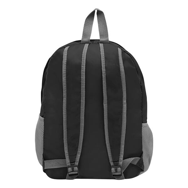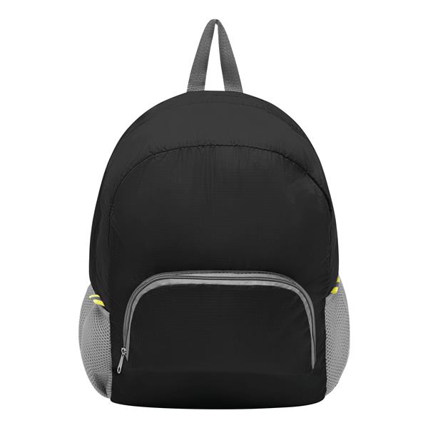 Plecak VOLUNTEER, składany dzięki przedniej kieszeni na zamek z dwustronnym suwakiem i uchwytem wewnątrz, przestronna komora główna na zamek, po bokach 2 siatkowe kieszonki i 2 odblaskowe metki, uchwyt do przenoszenia, regulowane wyściełane paski na ramiona – po złożeniu do formatu małej torebki można mieć go zawsze przy sobie.