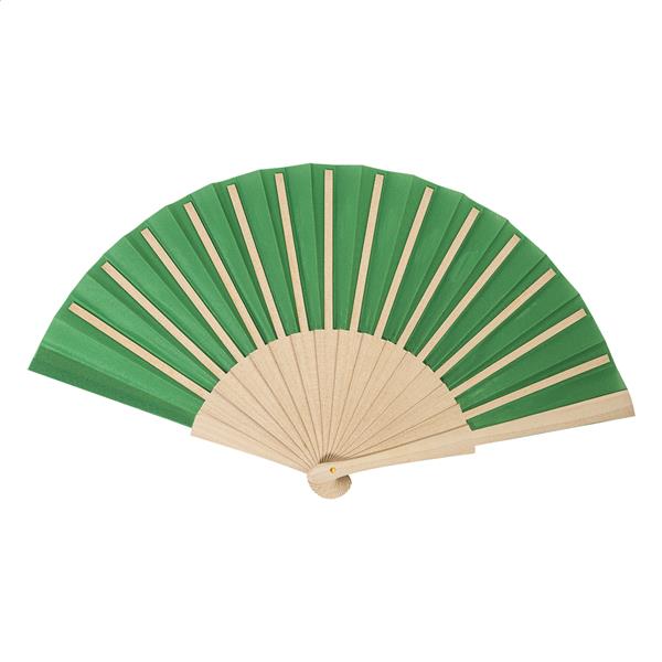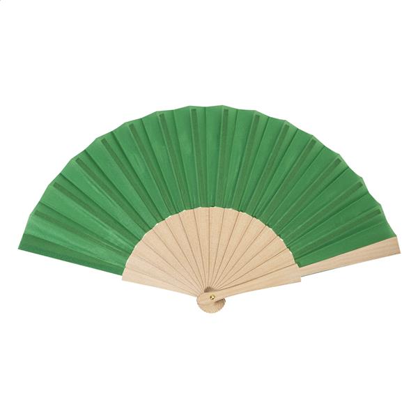 Wachlarz wykonany z poliestru RPET z drewnianymi żebrami.
