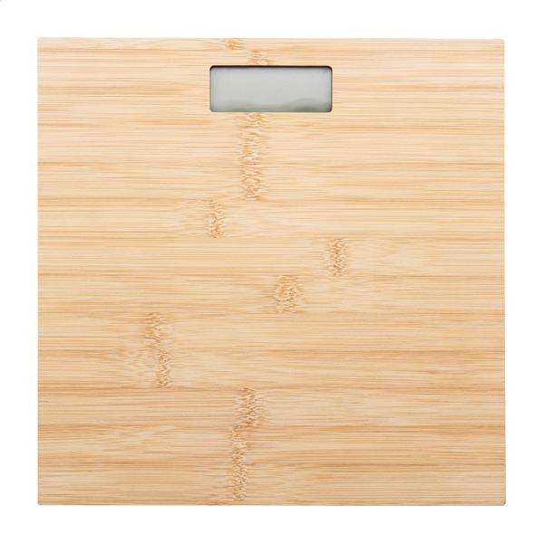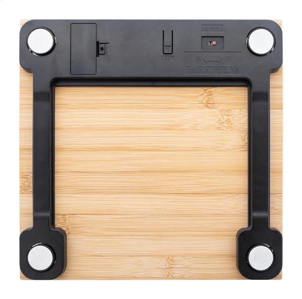 Cyfrowa waga łazienkowa z bambusową platformą wagową. Nośność: 150 kg, dokładność 0,1 kg, jednostki miary: kg/lb/st. Z wbudowanym akumulatorem. W zestawie kabel USB do ładowania.