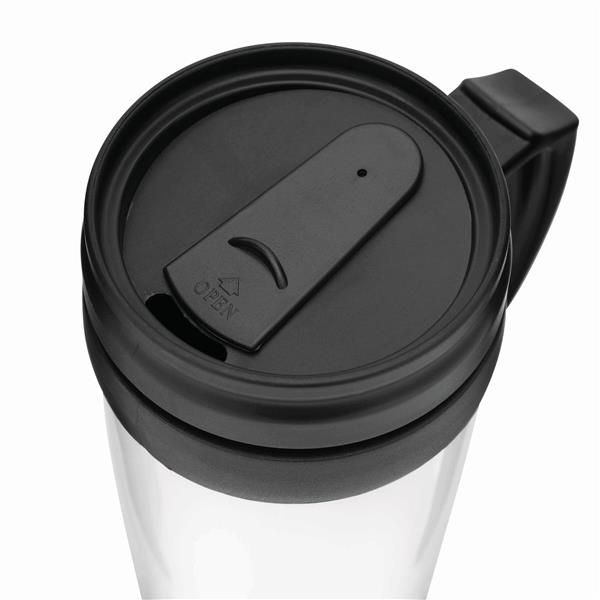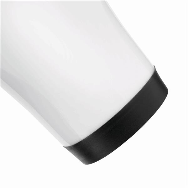 Kubek termoizolacyjny WARM-UP wykonany z plastiku wewnątrz i na zewnątrz. Z gumowaną powierzchnią do trzymania, z plastikowym wieczkiem i otworem do picia w wieczku, 400 ml.