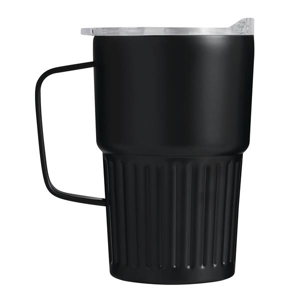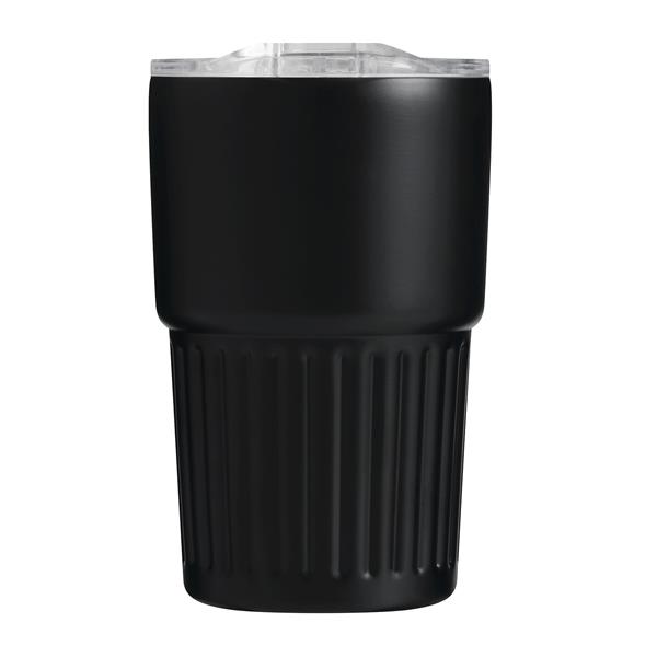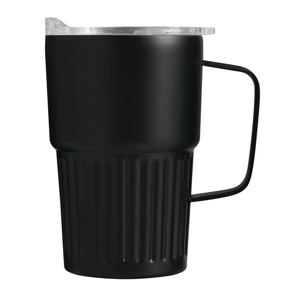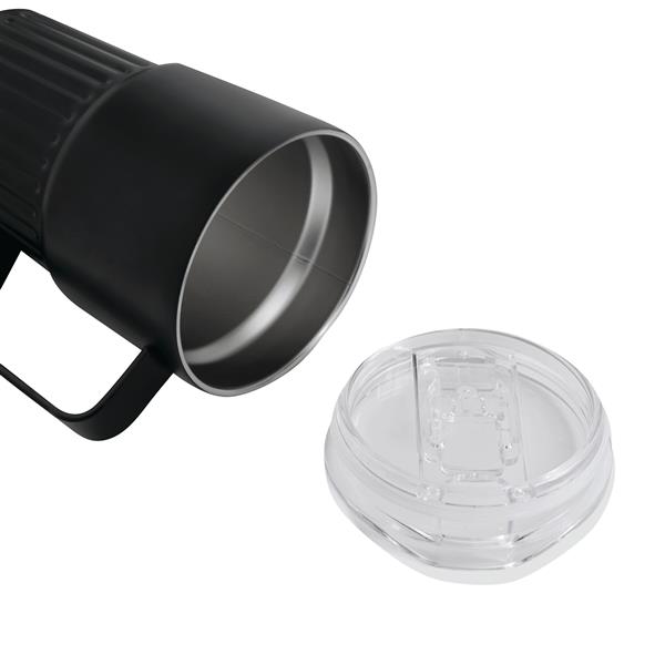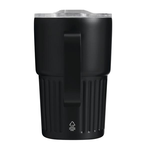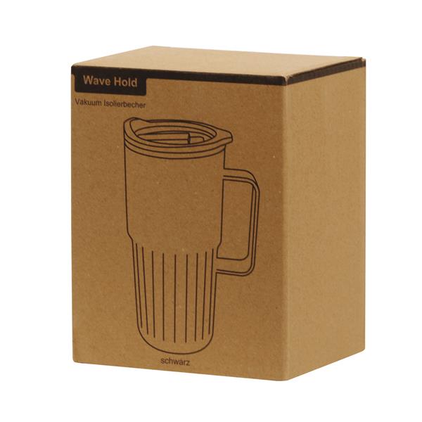 Próżniowy kubek WAVE HOLD z podwójną izolacją. Wewnątrz wykonany ze stali nierdzewnej z recyklingu, na zewnątrz ze stali nierdzewnej. Posiada praktyczny uchwyt, plastikową pokrywkę z silikonowym pierścieniem uszczelniającym i zintegrowanym przesuwanym otworem do picia. O pojemności ok. 450 ml. Utrzymuje ciepło przez ok. 4 godziny i zimno nawet do 8. Zapakowany jest w pudełko.