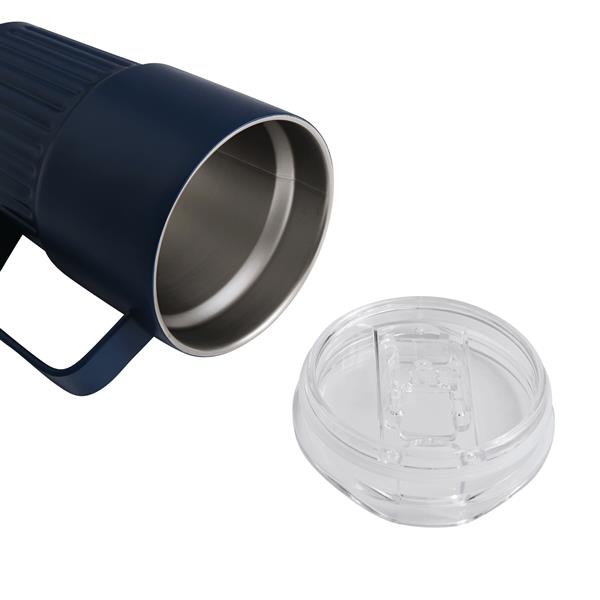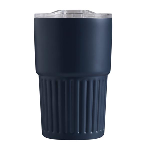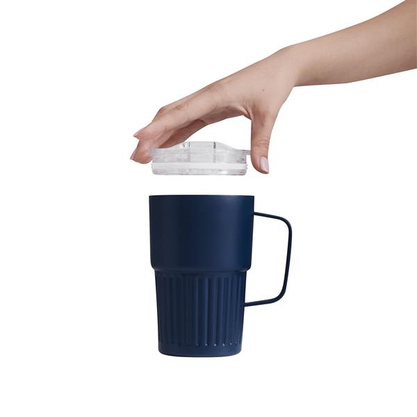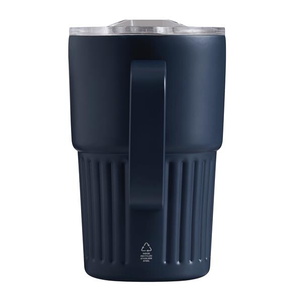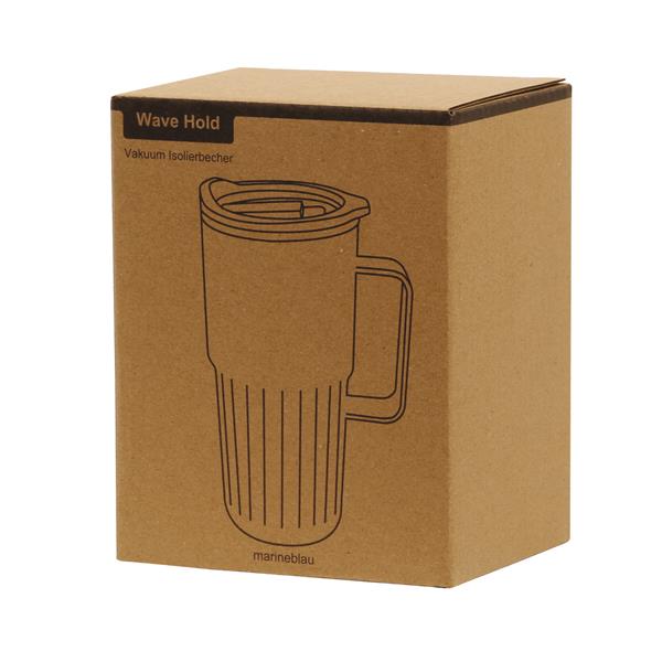 Próżniowy kubek WAVE HOLD z podwójną izolacją. Wewnątrz wykonany ze stali nierdzewnej z recyklingu, na zewnątrz ze stali nierdzewnej. Posiada praktyczny uchwyt, plastikową pokrywkę z silikonowym pierścieniem uszczelniającym i zintegrowanym przesuwanym otworem do picia. O pojemności ok. 450 ml. Utrzymuje ciepło przez ok. 4 godziny i zimno nawet do 8. Zapakowany jest w pudełko.