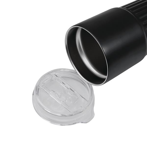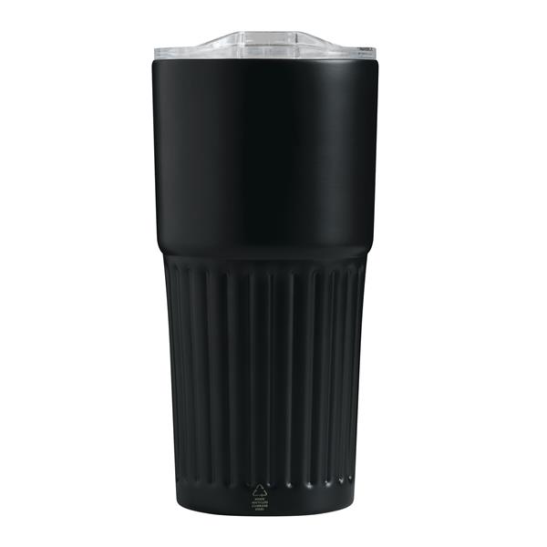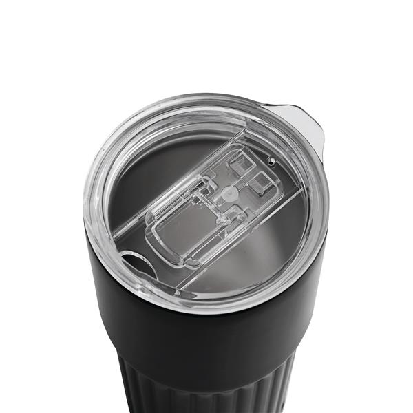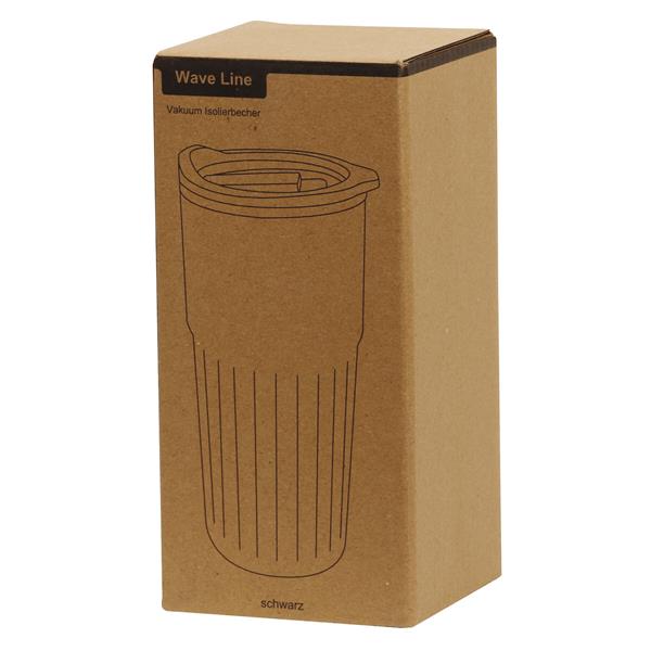 Próżniowy kubek WAVE LINE z podwójną izolacją. Wewnątrz wykonany ze stali nierdzewnej z recyklingu, na zewnątrz ze stali nierdzewnej. Posiada plastikową pokrywkę z silikonowym pierścieniem uszczelniającym i zintegrowanym przesuwanym otworem do picia. O pojemności ok. 600 ml. Utrzymuje ciepło przez ok. 4 godziny i zimno nawet do 8. Zapakowany jest w pudełko.