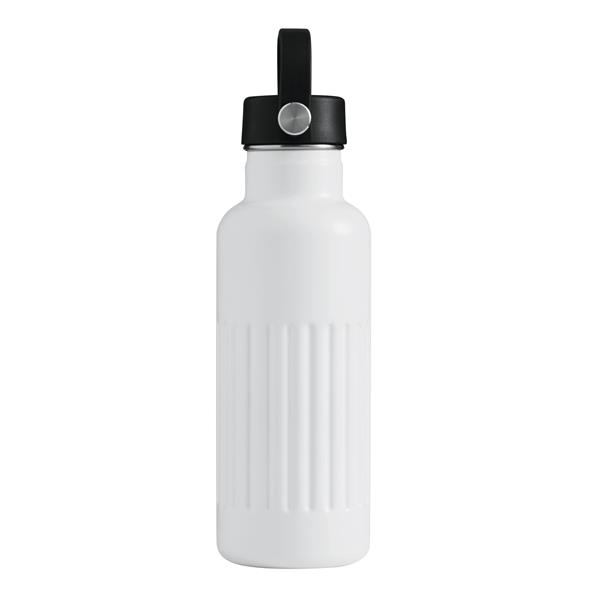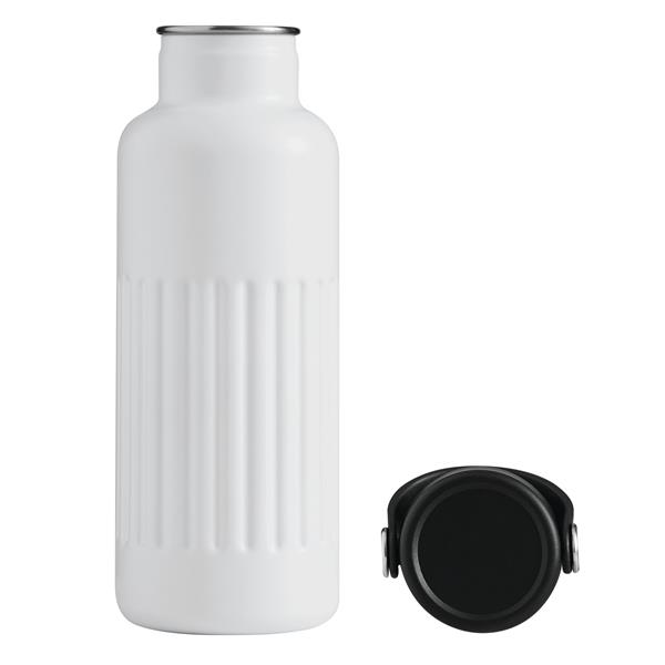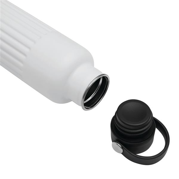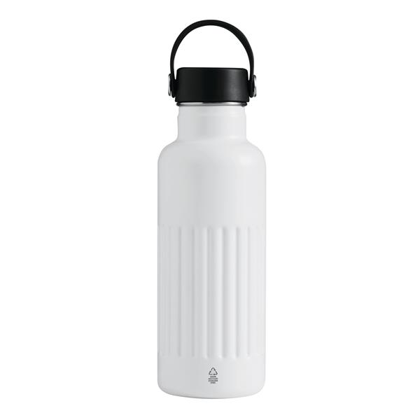 Próżniowa butelka WAVE TRAIL z podwójną izolacją. Wewnątrz wykonana ze stali nierdzewnej z recyklingu, na zewnątrz ze stali nierdzewnej. Posiada pokrywkę z bezpieczną zakrętką, silikonowym pierścieniem uszczelniającym i plastikowym paskiem do przenoszenia. O pojemności ok. 500 ml. Utrzymuje ciepło przez ok. 8 godzin i zimno nawet do 12. Zapakowana jest w pudełko.