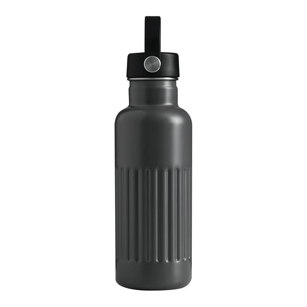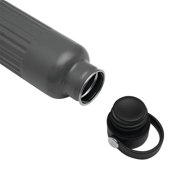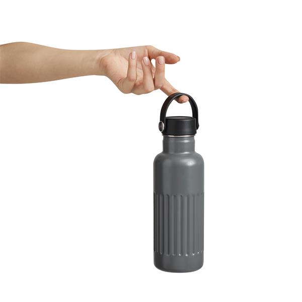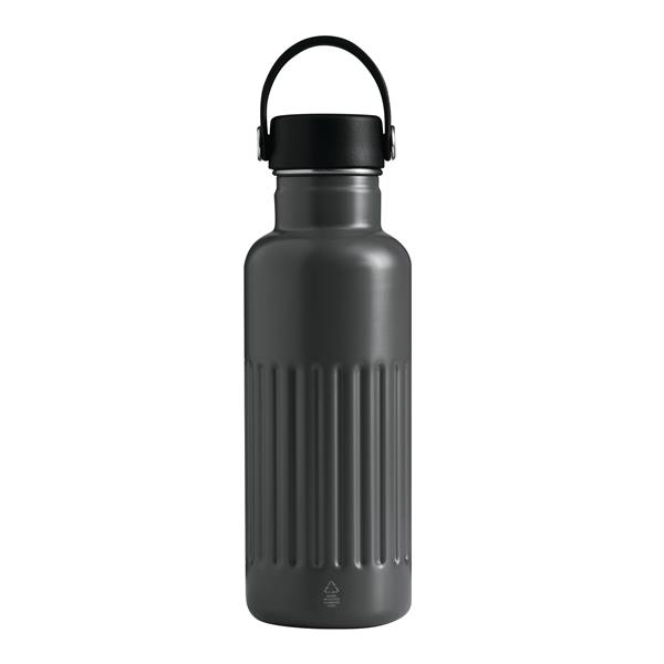 Próżniowa butelka WAVE TRAIL z podwójną izolacją. Wewnątrz wykonana ze stali nierdzewnej z recyklingu, na zewnątrz ze stali nierdzewnej. Posiada pokrywkę z bezpieczną zakrętką, silikonowym pierścieniem uszczelniającym i plastikowym paskiem do przenoszenia. O pojemności ok. 500 ml. Utrzymuje ciepło przez ok. 8 godzin i zimno nawet do 12. Zapakowana jest w pudełko.