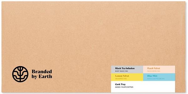 Zestaw upominkowy unisex marki Branded by Earth. Zawiera cztery 50gr wegańskie kostki: do mycia ciała, do mycia włosów, do pilingu twarzy oraz wodę micelarną również w kostce, a także korkową podstawkę pod mydełka. Każda kostka zapakowana w papier. Całość w pudełku z papieru z recyklingu. Wyprodukowano w UE Korek jest materiałem w 100% naturalnym. Ze względu na jego strukturę i porowatość powierzchni ostateczny wygląd nadruku na każdym artykule może się różnić.