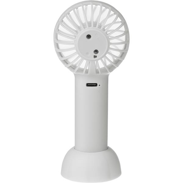 Wentylator kieszonkowy z baterią 600 mAh i portem ładowania typ-C, zawiera kabel do ładowania, co umożliwia jego ponowne naładowanie, posiada podstawkę do ustawienia w pozycji pionowej i może być używany osobno podczas podróży, oferuje trzy tryby prędkości, pakowany pojedynczo w brązowe kartonowe pudełko, produkt wykonany z ABS