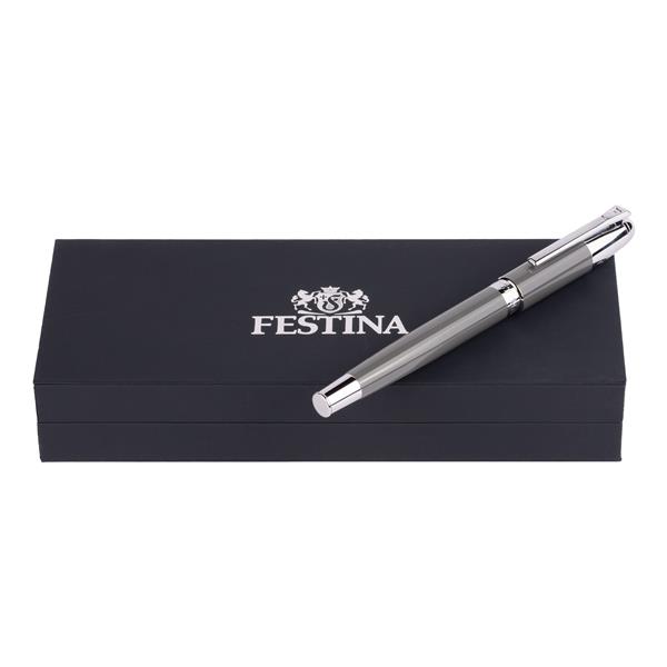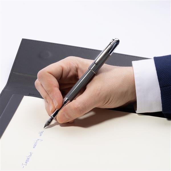Eleganckie, idealnie wyważone pióro wieczne w wielu wariantach kolorystycznych z subtelnymi chromowanymi akcentami. Pióro posiada wkład piszący na niebiesko. Rozmiar: Dia. 10 / h. 137 mm Kolor: Szary