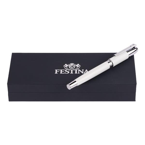 Eleganckie, idealnie wyważone pióro wieczne w wielu wariantach kolorystycznych z subtelnymi chromowanymi akcentami. Pióro posiada wkład piszący na niebiesko. Rozmiar: Dia. 10 / h. 137 mm Kolor: Biały