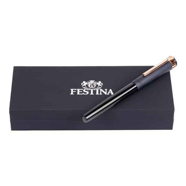 Pióro wieczne Prestige w kolorze granatowo-złotym inspirowane jest zegarkami Festina. Charakteryzuje się elegankim, minimalistycznym wykończeniem. To połączenie matowej, chromowanej nasadki i błyszczącego chromowanego korpusu i lamówek.