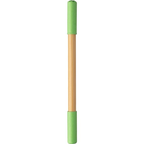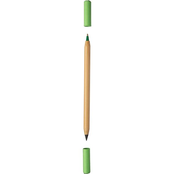 „Wieczny” ołówek i długopis w jednym, wolnościerająca się końcówka ołówka powoduje jego dłuższe zużycie, posiada dwie kolorowe zatyczki z kartonu, produkt wykonany z bambusa
