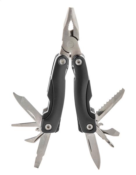 Wielofunkcyjne narzędzie ze stali nierdzewnej w opakowaniu z poliestru.
