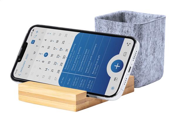 Wielofunkcyjny stojak na biurko RPET z podstawą na telefon komórkowy i miejscem na długopisy. Description: Wielofunkcyjny stojak na biurko RPET z podstawą na telefon komórkowy i miejscem na długopisy. Primary Color: naturalny Secondary Color: szary Material 1: Bambus Material 2: Filc PET z recyklingu Rozmiar: 117×92×85 mm