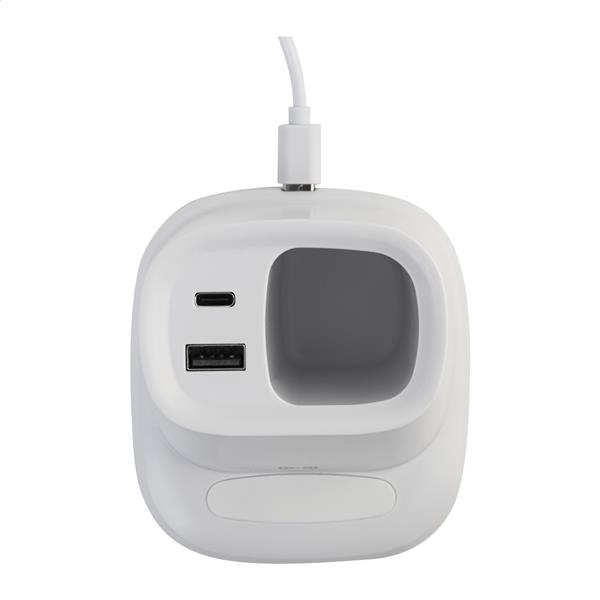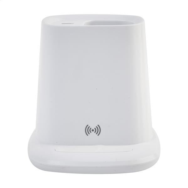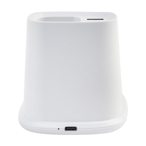 Wielofunkcyjny uchwyt na długopisy z recyklingowanego ABS z uchwytem na telefon, wbudowaną szybką ładowarką bezprzewodową (10 W), 1 portem USB i 1 portem USB-C. W zestawie kabel USB do ładowania.